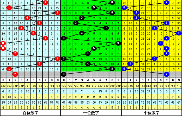 另外组选开奖中,号码大小比为5:10,小 号开出比例较高;号码奇偶比为4:11,偶数号码开出频次较高;号码012路为4:5:6,基本握平。且每期开奖与最近5期开奖王人莫得出现调换的号码。(统计见下表)