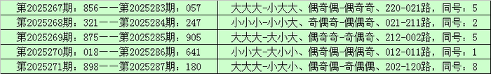 统计枚举三已开出的奖号发现,在鸠合5期(第2025267期-第2025271)奖号为:856-321-875-018-898。