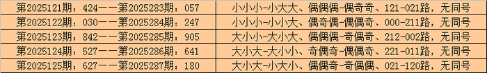 在枚举三历史开奖中,第2025121期-第2025125期鸠合5期奖号为:424-030-842-527-627。