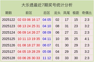 上期大乐透的开奖号码中,首尾组合为03+33,极距为30,奇偶比为2:3。