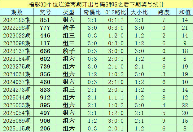 个位号码:最近两期个位开出号码为5-5,在福彩3D历史开奖中,前后两期个位分辨开出号码5-5的奖号出现了94次。最近15期个位5-5组合出现之后,其下期奖号分辨为:851-777-446-117-666-602-739-856-460-833-912-895-497-906-206;
