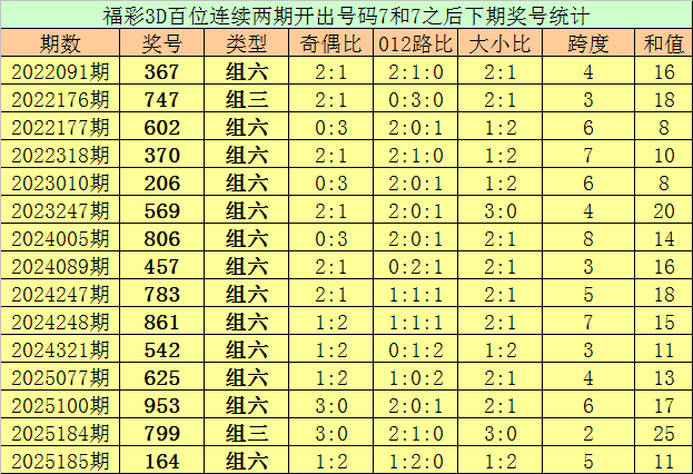 百位号码:畅达两期百位出号分辨为:7-7,历史上福彩3D畅达两期前后分辨出号7-7的奖号共出现94次。在百位7-7的奖号振奋出当前,近15期下期分辨出号:367-747-602-370-206-569-806-457-783-861-542-625-953-799-164;