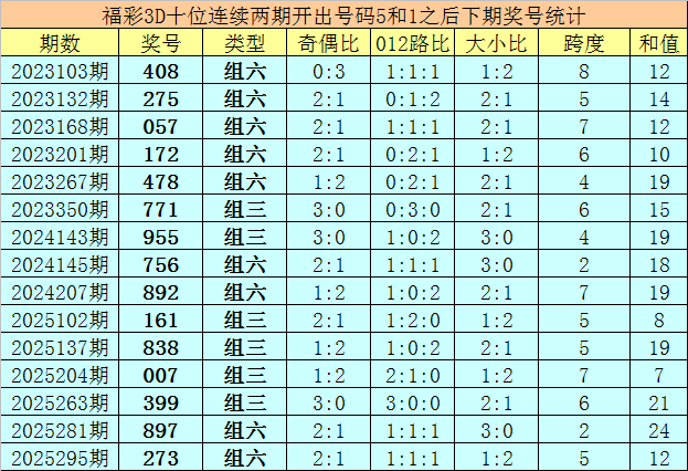 十位号码:前两期十位分辨出现奖号5-1,历史上福彩3D畅达前后分辨开出号码5-1的振奋共开出95次。在十位5-1的振奋出当前,最近15期其下期分辨开出号码:408-275-057-172-478-771-955-756-892-161-838-007-399-897-273;
